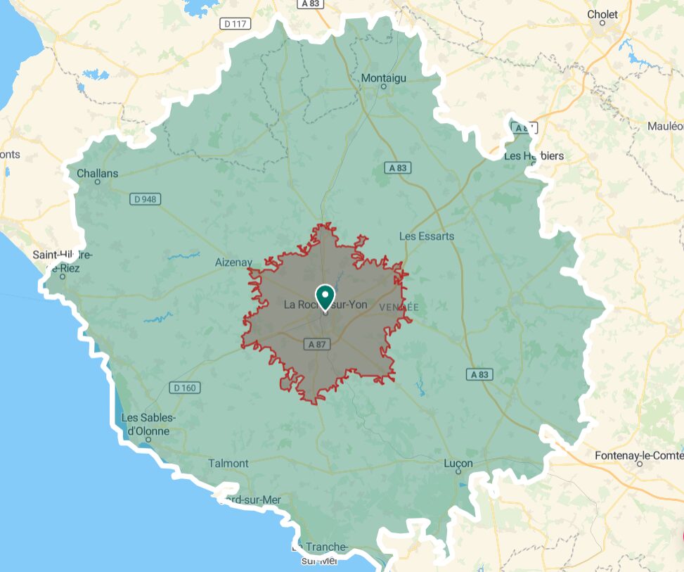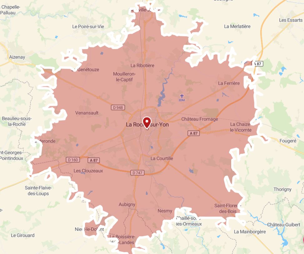 Je me déplace gratuitement aux alentours de La Roche sur Yon (85) sur 15 km alentours. Au delà de cette zone, les frais kilométriques s’appliquent.